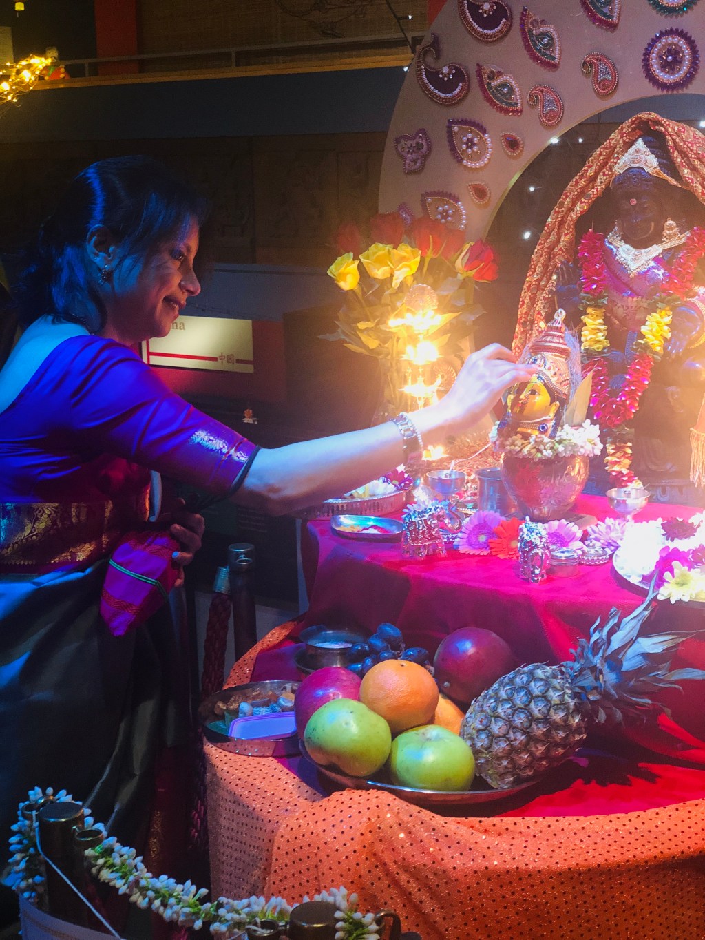 Another example of a museum allowing use of an object by a community is at the Oriental Museum in Durham, England. A bronze statue of the goddess Lakshmi has been used in recent years by the local Hindu community for the Diwali festival of lights, taking place at the museum itself. The statue is surrounded with flowers, herbs and spices, and is anointed with organic substances. Hundreds of Hindu and non-Hindu people attend this event, bringing visibility to Hindu practices and the material culture connected to it within the museum. An event such as this with an object from the collection at the center sends a message to those who attend. A message that this space is not just for artefacts and academics, but is also for them as people and for their community. With an event like Diwali being held at the museum and conducted by local Hindus, the space is transformed into a place where a culture’s objects and practices are embraced all at once.