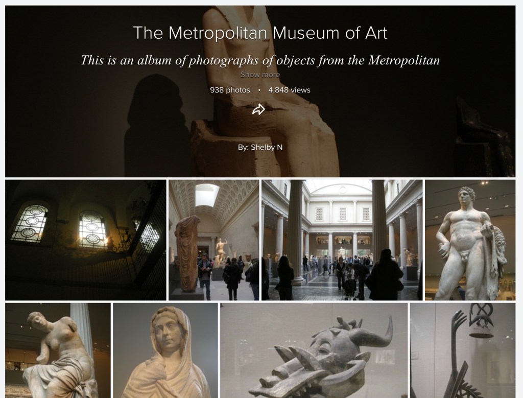 In 2007 I began a Flickr account where I shared my museum photography with the aims of making photographs of, and information on, museum objects more accessible to the public. During my own reseach I often found it difficult to locate high quality images of objects for my studies. My images have been requested for use in historical themed games, personal research projects, and more. My largest album of photgraphs from the Metropolitan Museum of Art in NYC has reached nearly 5,000 viewers.